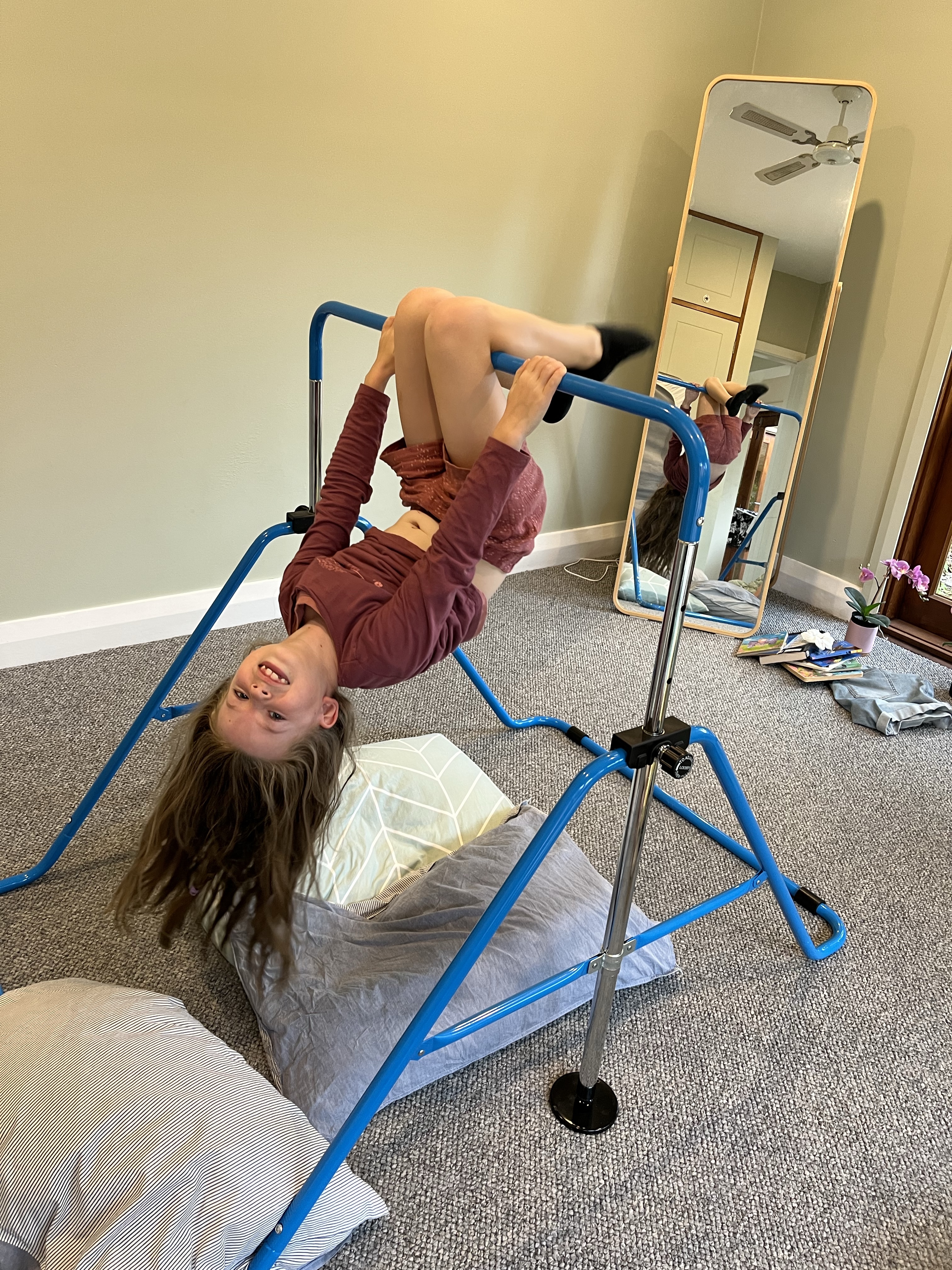 Carla loves gymnastics, and spends most of her time hanging head down on her gymnast bar at home.