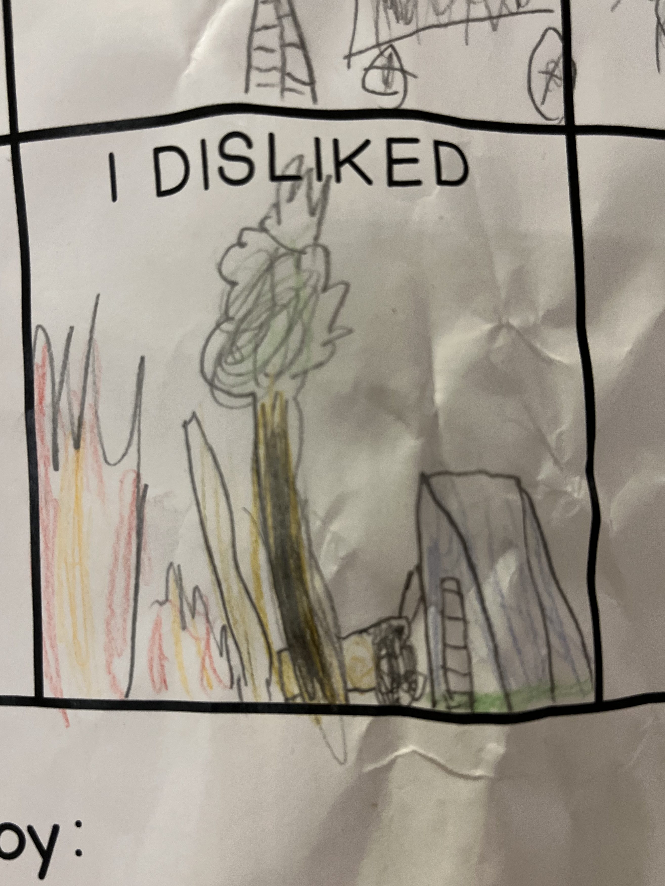 Carla had lots of questions, and had a little cry when we came home, but it wasn’t really until Gustavs first day back at school that I realised he also put a lot of thought into the experience. This was his drawing of what he disliked about the school holidays: